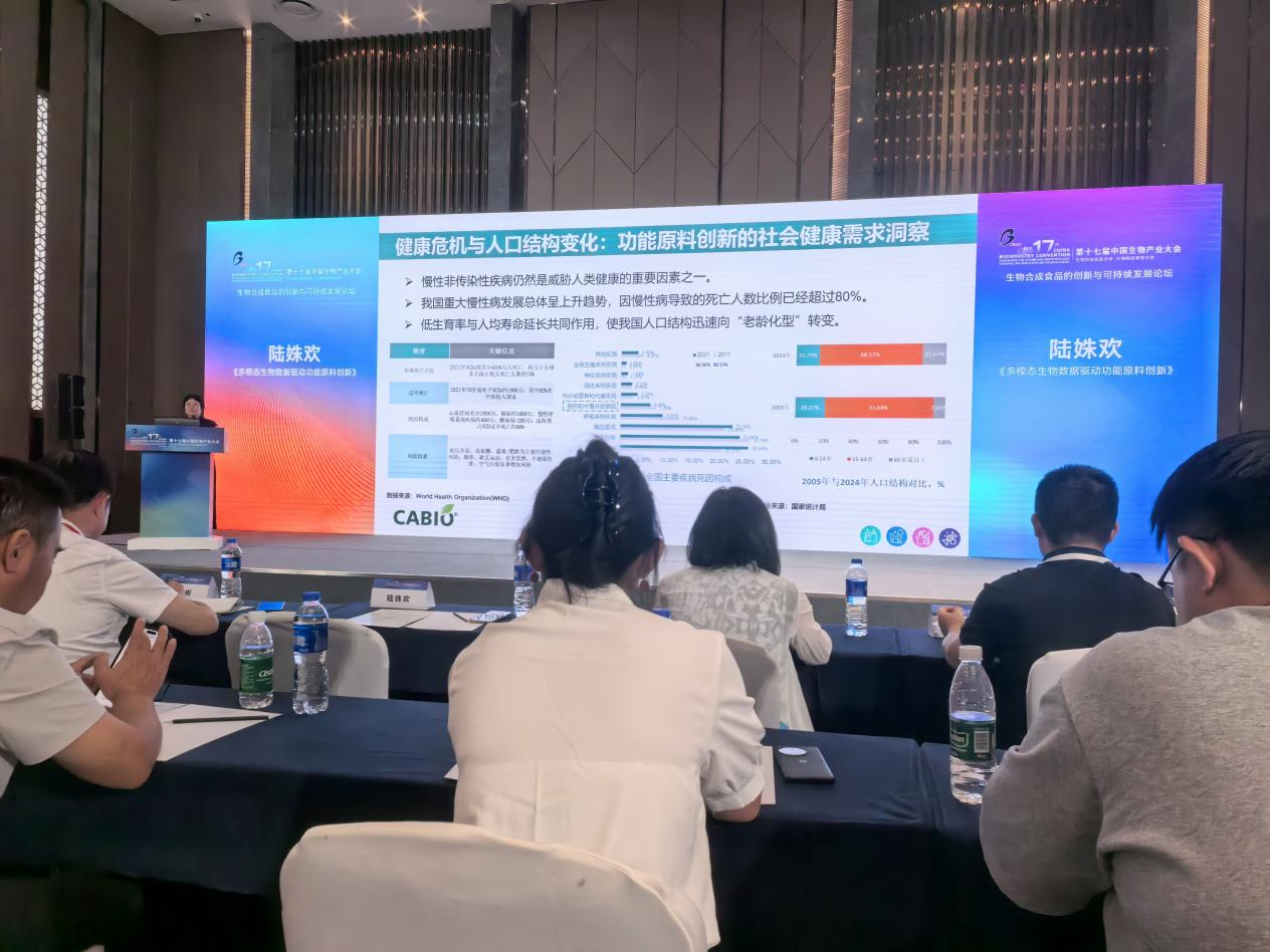 嘉必優(yōu)生物技術(shù)(武漢)股份有限公司研發(fā)總監(jiān)陸姝歡博士在生物合成食品的創(chuàng)新與可持續(xù)發(fā)展論壇以《多模態(tài)生物數(shù)據(jù)驅(qū)動功能原料創(chuàng)新》為主題做出精彩匯報。本次主題演講聚焦“數(shù)據(jù)驅(qū)動”與“功能原料創(chuàng)新”的深度融合,系統(tǒng)闡釋了多模態(tài)生物數(shù)據(jù)在打破傳統(tǒng)研發(fā)壁壘中的核心價值。報告指出,通過整合基因組學(xué)、代謝組學(xué)等多維度生物數(shù)據(jù),能夠精準(zhǔn)解碼原料的功效機制與作用靶點,為功能原料的篩選、優(yōu)化及產(chǎn)業(yè)化提供了全新的科學(xué)路徑。這一思路不僅推動功能原料研發(fā)從“經(jīng)驗驅(qū)動”向“數(shù)據(jù)驅(qū)動”轉(zhuǎn)型,更有望加速兼具高活性、高安全性與高適用性的創(chuàng)新原料落地,為大健康、美妝等相關(guān)產(chǎn)業(yè)的高質(zhì)量發(fā)展注入新動能,引發(fā)與會專家強烈共鳴。